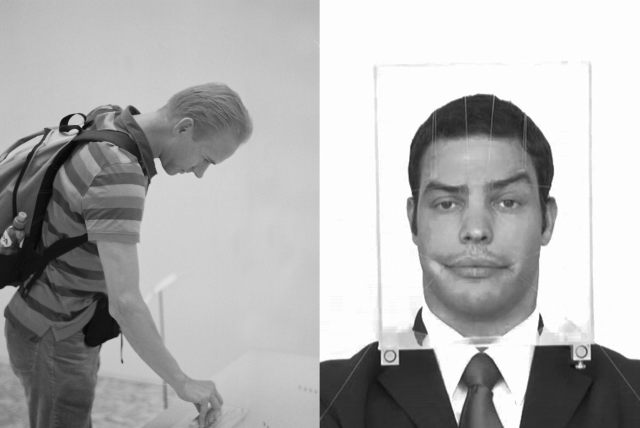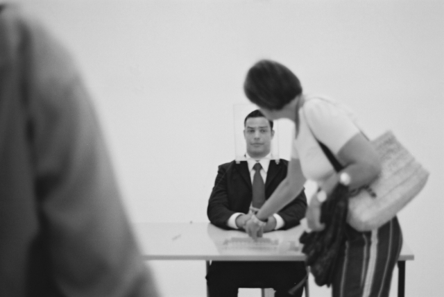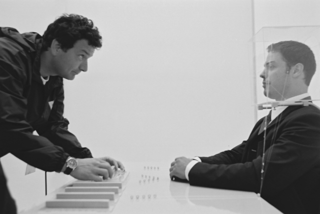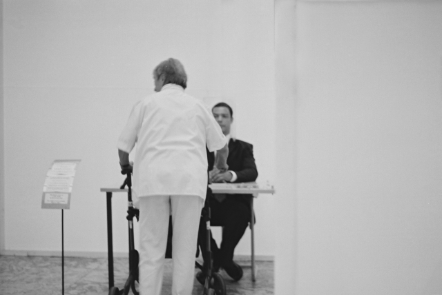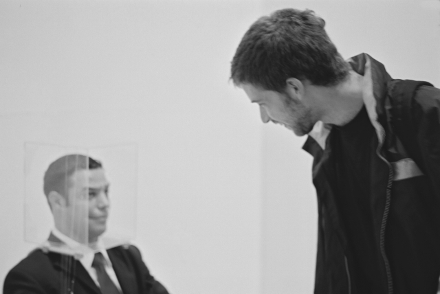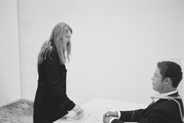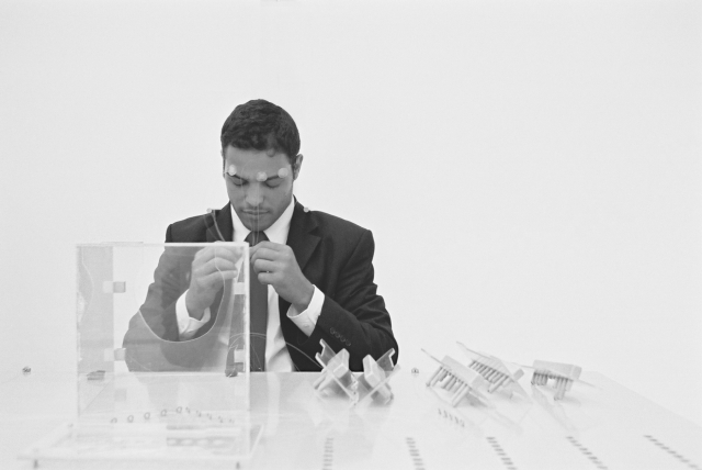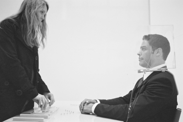 Das Subjekt sitzt hinter seinem Schreibtisch. Sein Kopf wird voll umrahmt von einer fixierten Glashaube. Eingebaut in seiner eigenen Sitzhaltung, wirken seine wenigen Bewegungen steif und begrenzt, trotzdem erscheint er in seiner Person entspannt. Auf dem Tisch befindet sich ein subtiler Aufbau von Plexiglas, Nylonfäden und Stahlführungen. Die Nylonfäden sind in geordneten Reihen über der Tischplatte aufgespannt und führen nach oben zur Glashaube. Das Subjekt spricht nicht.