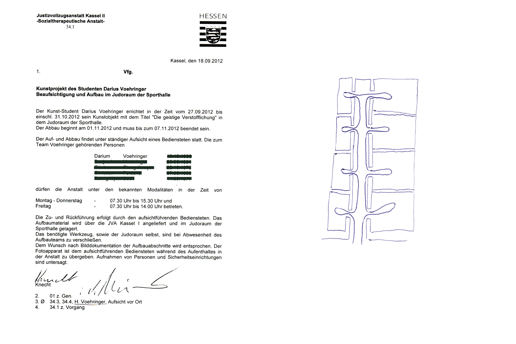Die Justizvollzugsanstalt Kassel ist eine geschlossene Anstalt und bildet damit einen hermetisch abgeschlossenen Bereich. Ein Wesen mit klar definierter Begrenzung, das sich eigenverantwortlich verwaltet. Damit bildet die JVA etwas, das sich als Apparat beschreiben lässt, welcher ein internes Selbst besitzt und über sich selbst verfügt. Der Transit von Material, Energie und Personen wird reguliert und die betrieblichen Prozesse werden intern geregelt. Das Projekt Die Geistige Verstoffwechselung beschäftigt sich mit den internen und externen Funktionen dieses Apparates und beschreibt ihn als eine Art Organismus. Es nimmt weniger Bezug auf die gesellschaftlichen Strukturen innerhalb der Anlage, sondern viel mehr auf die Biologie der Sache selbst. Überträgt man das Schema der Justizvollzugsanstalt auf das einer biologischen Zelle, so stößt man auf identische Grundmuster. Zwischen Mikro- und Mesobereich bestehen bei diesem Vergleich spezifische Parallelen. Beide Apparate, sowohl der biologische, als auch der bauliche, funktionieren als Raum eines Prozesses, als geschlossener Apparat mit einem Eigenleben, in dem Austausch und innere Entwicklung stattfindet. Der Grundaufbau der Zelle, die kleinste selbst-ständig lebende Einheit, besteht aus einer Zellmembran, einem Zellleib und einem Zellkern. Die Membran reguliert den Austausch der ein- und austretenden Stoffe zwischen dem Intra- und Extrazellularraum. Die Zelle ist in ihrer Umgebung zur Reizaufnahme fähig und in der Lage Reize zu beantworten. Innerhalb der Zelle findet die sogenannte Verstoffwechselung statt und die damit verbundene Energiegewinnung. Die Installation im Inneren der JVA II beschreibt den Versuch ein geschlossenes Organ mit einer ihr fremden Form des Stoffwechsels zu konfrontieren. Damit wird ein biochemischer Prozess initiiert, der einen unvorhersehbaren Austausch in Gang setzt. Die eingebettete Arbeit in der JVA wird, als weiteres Organell der Anlage, einen Teil des Verstoffwechselungs-prozesses übernehmen. Die Handlung als künstlerische Konfrontation entsteht aus poetischer Sicht und behandelt die Justizvollzugsanstalt als eine intellektuelle und physische Form, eine lebensbeinhaltende Zelle, einen Informations-träger. Das Einbringen des Projektes in diesen Ort lässt sich als Prozess der Befruchtung beschreiben.